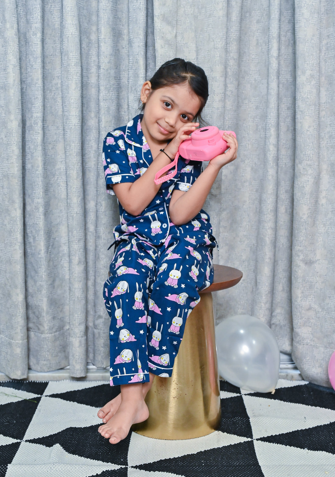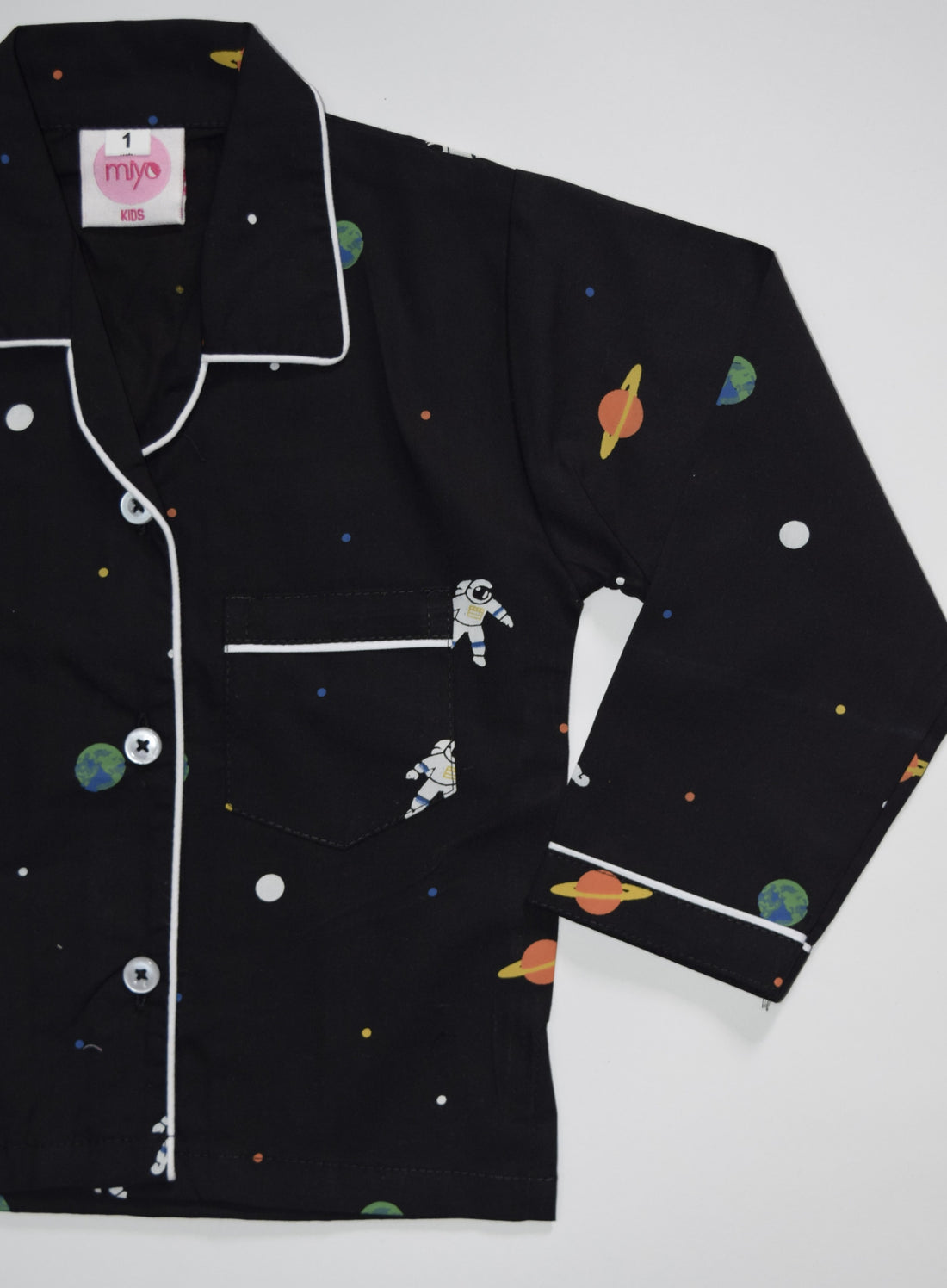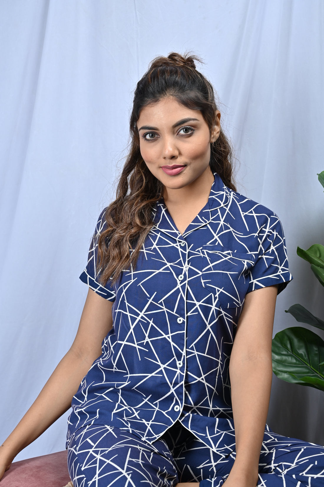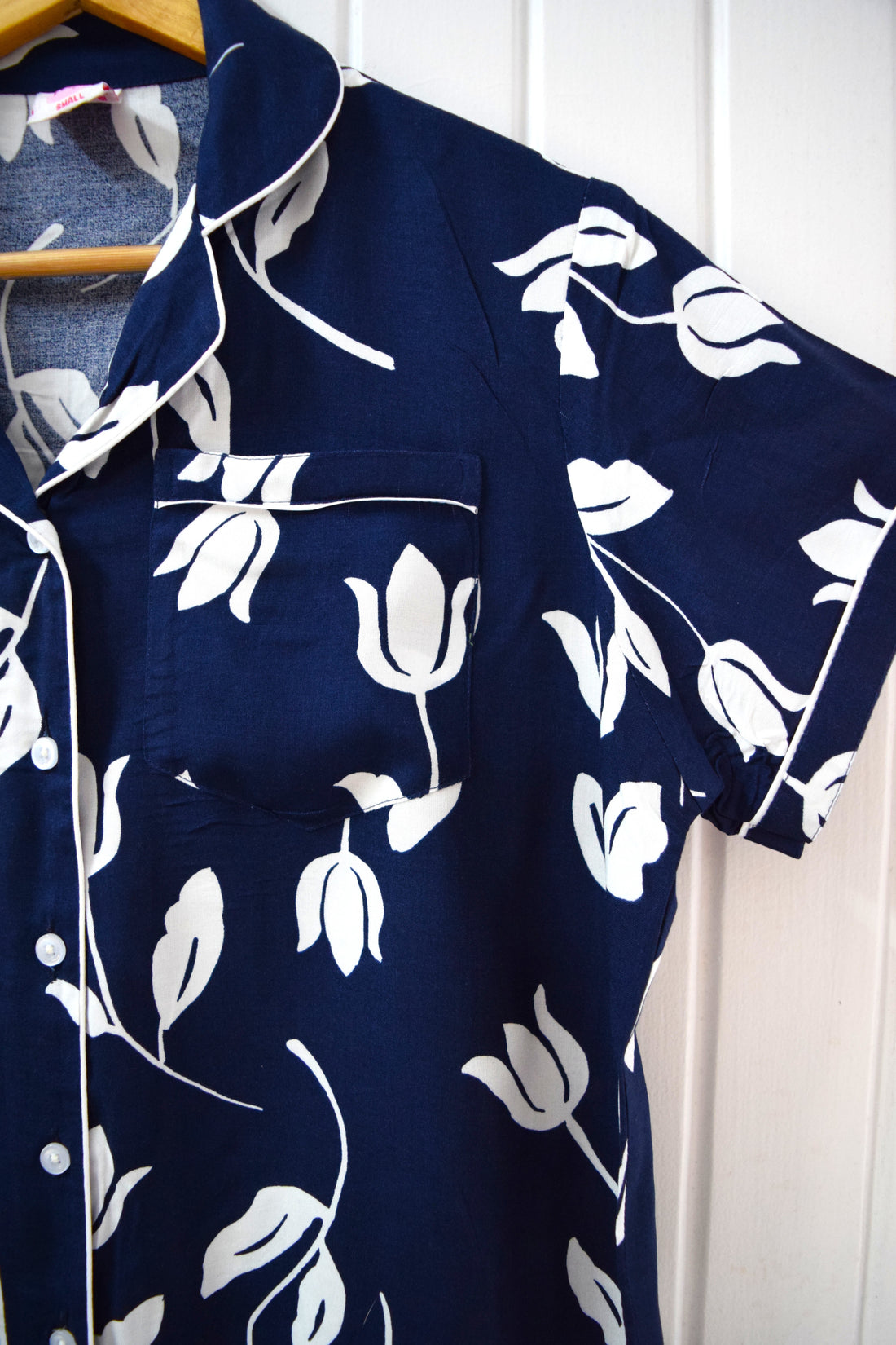 Close-up view of the handmade rayon cotton black and white abstract floral pajama set for women, showcasing the print and soft fabric.