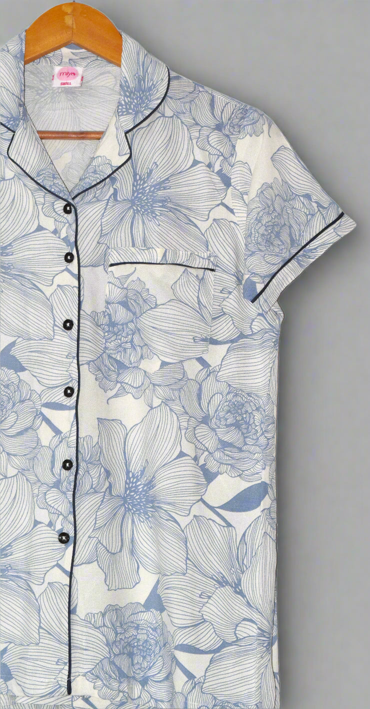 Shop the Blue & White Floral Rayon Cotton PJ Set – a breathable, soft, and...