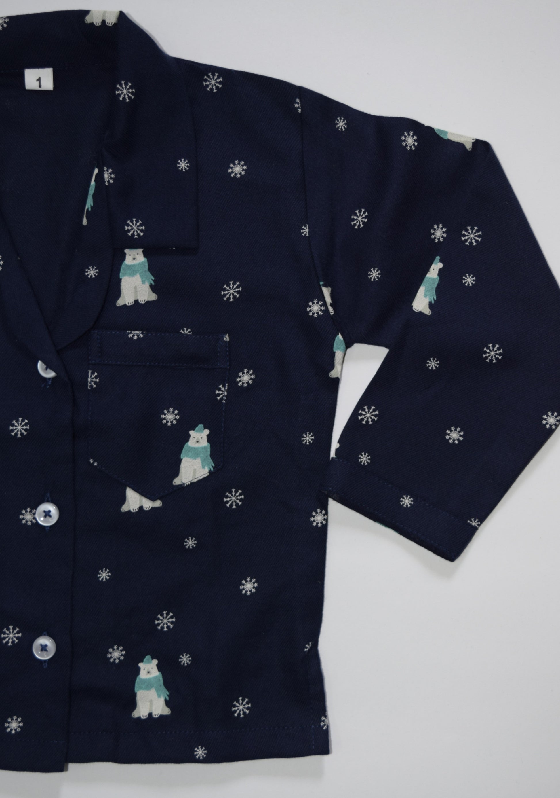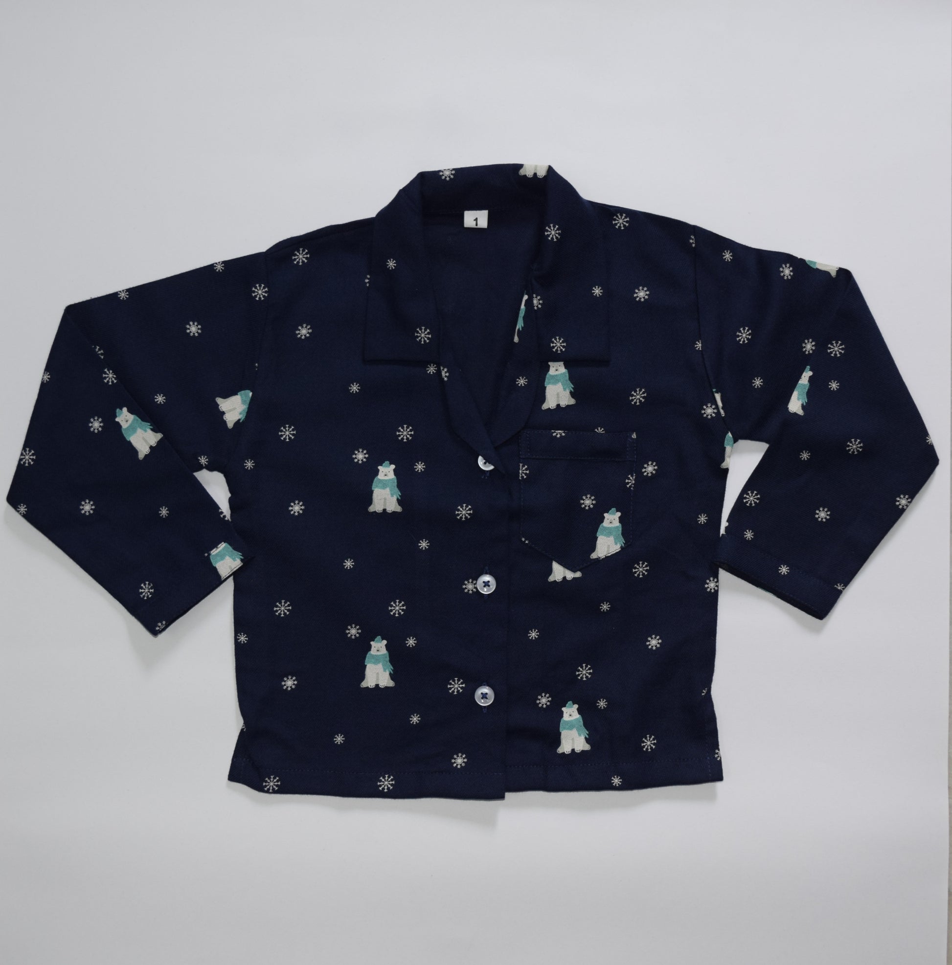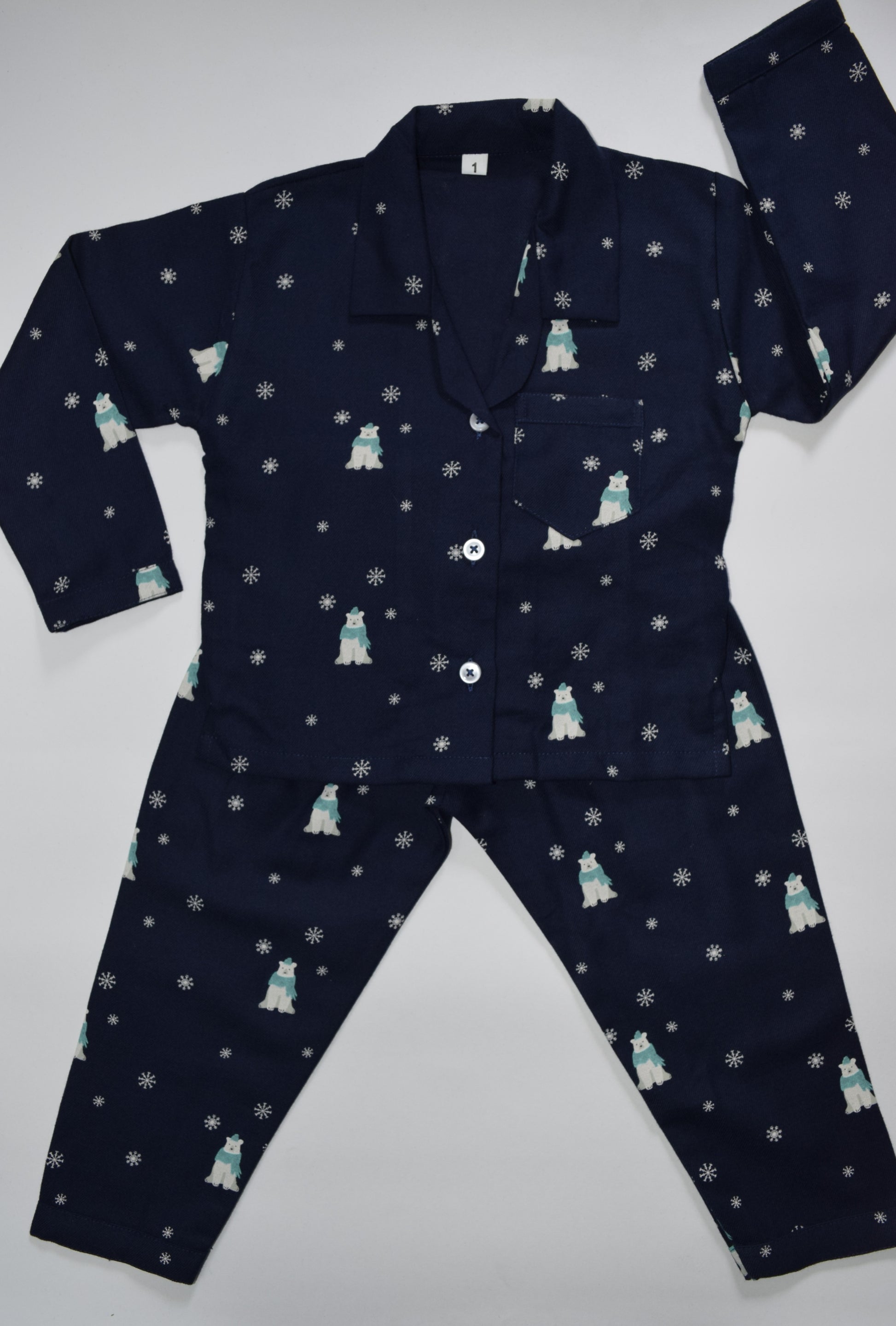 Keep your little one cozy with this adorable flannel nightwear for kids, perfect for bedtime or lounging. Made from ultra-soft flannel fabric, this kids' nightwear offers warmth and comfort during chilly nights. Featuring a playful polar bear print on a stylish navy blue background, the set includes a button-down top with a relaxed collar and matching pajamas. This flannel nightsuit is breathable, durable, and designed to ensure a snug fit for uninterrupted sleep. Ideal for winter, this charming nightsuit for kids combines style, comfort, and warmth effortlessly!