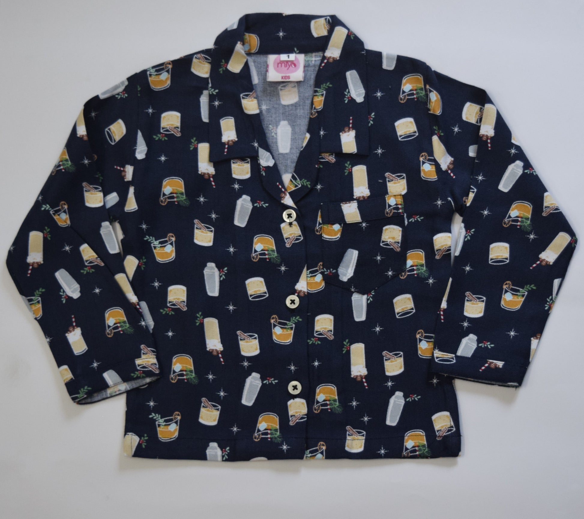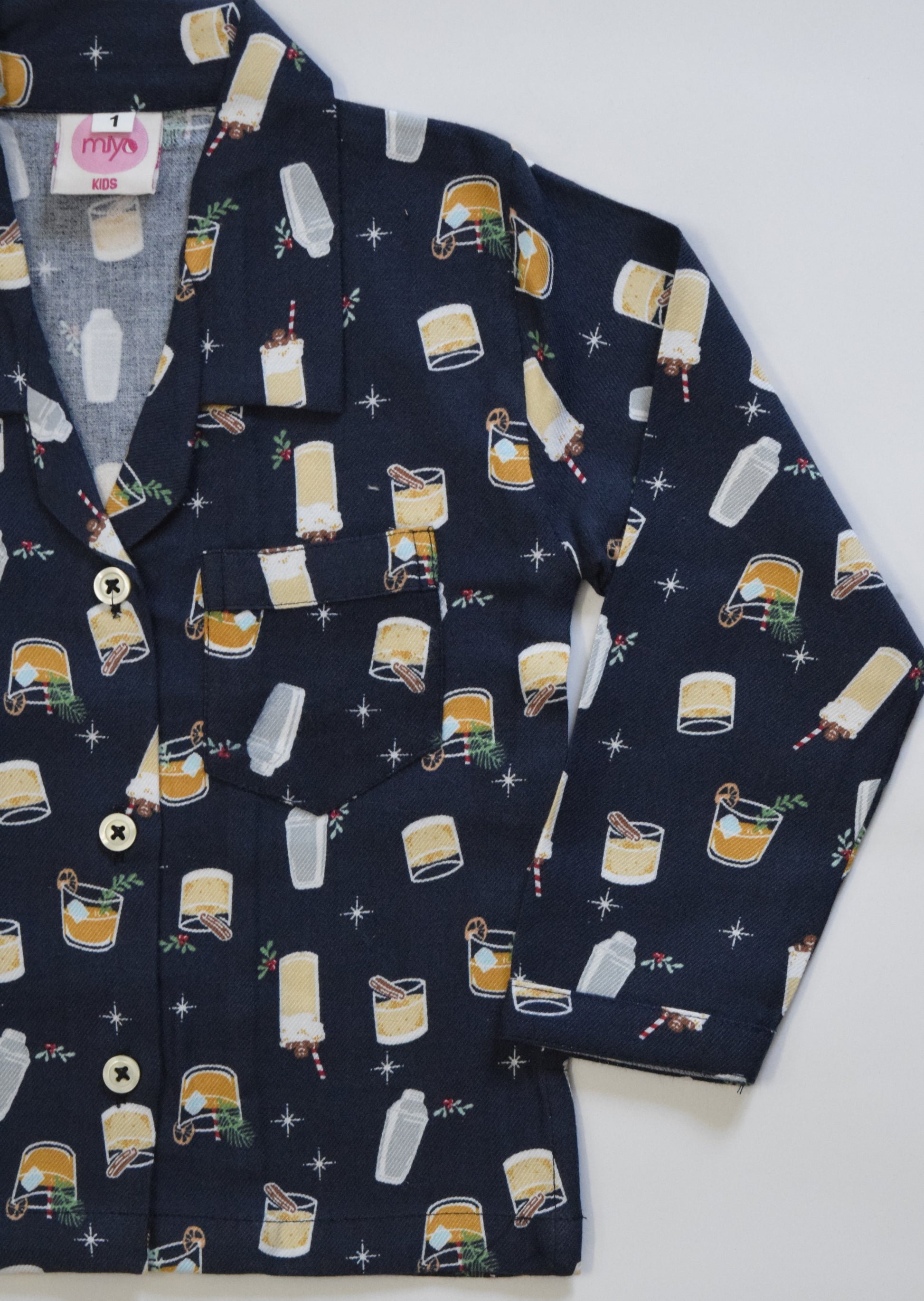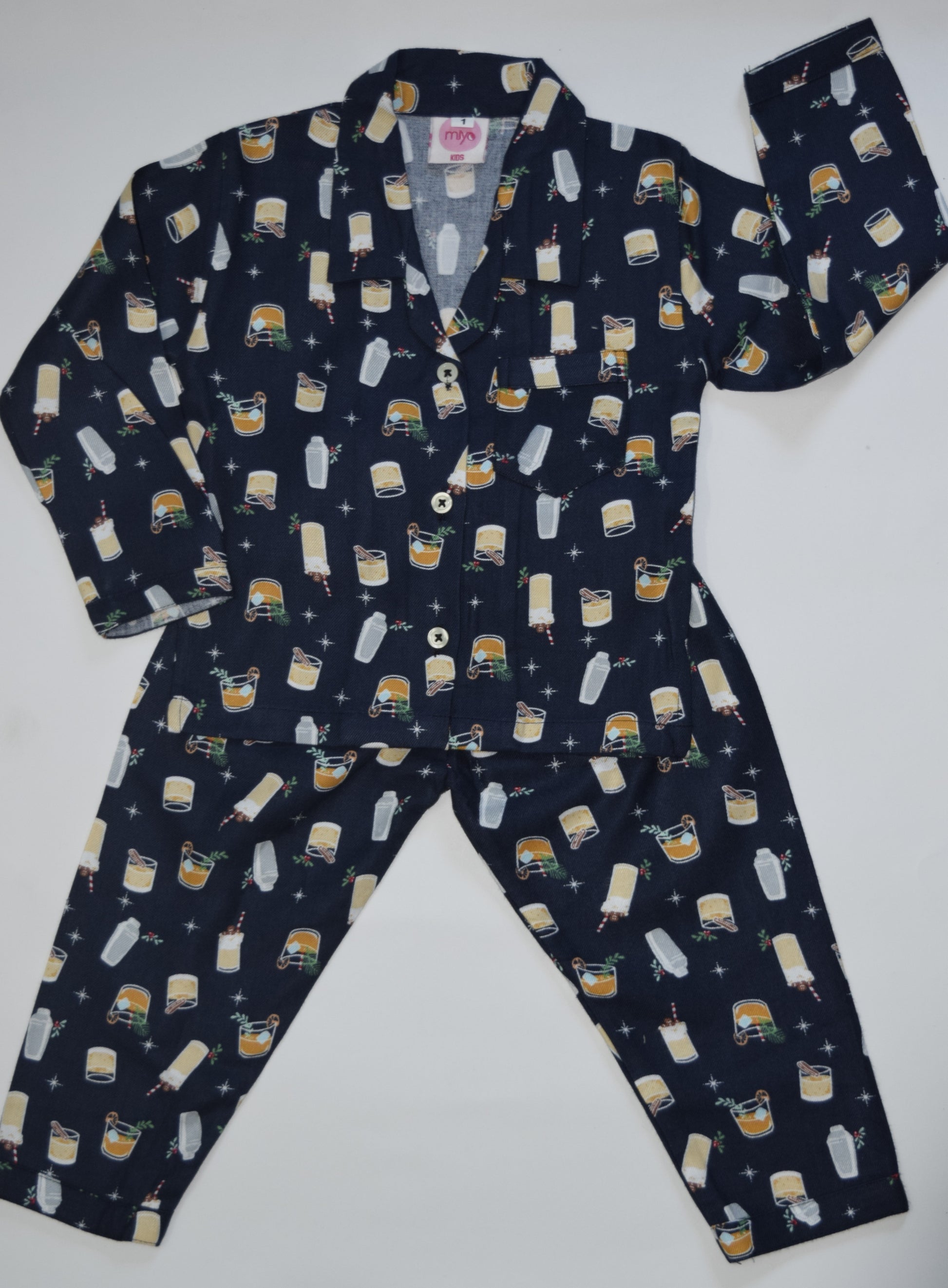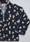 Wrap your little one in cozy comfort with this kids' fleece nightwear. Crafted from ultra-soft fleece fabric, it features a fun drink-themed print with festive glasses and playful details on a navy blue background. The button-down shirt, relaxed collar, and long sleeves make it perfect for bedtime or lounging. Designed for warmth during chilly winter nights, this breathable and durable nightwear ensures all-night comfort