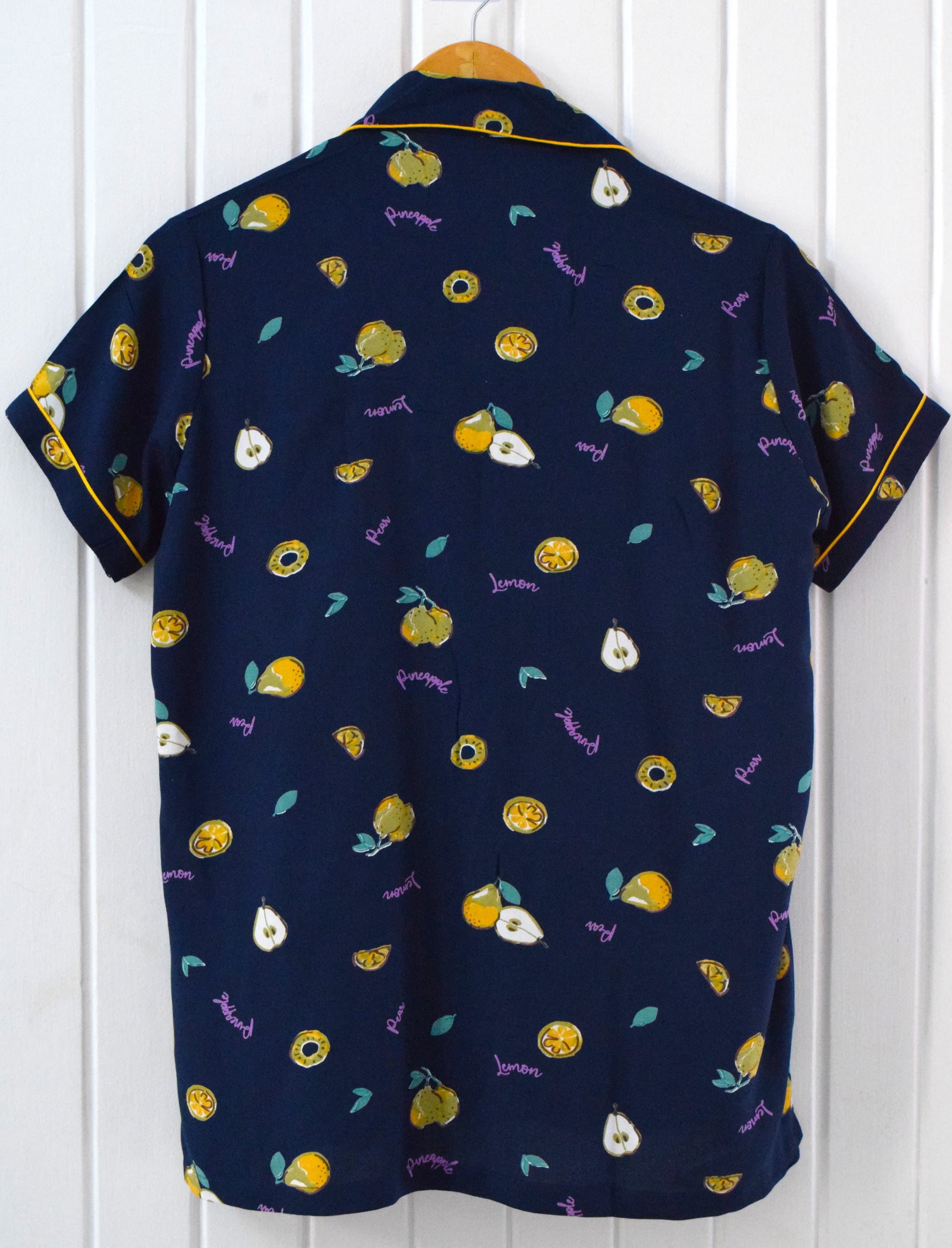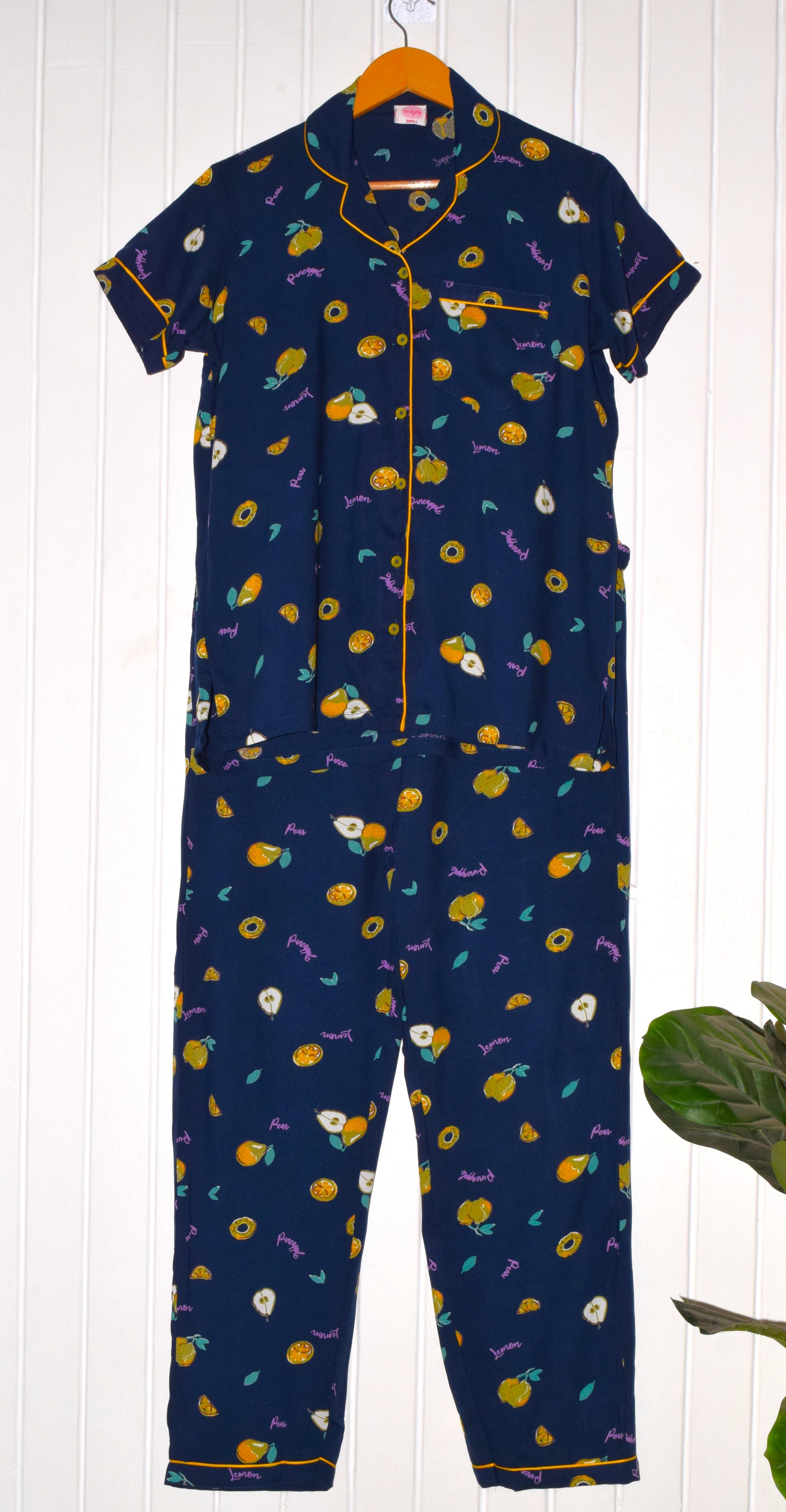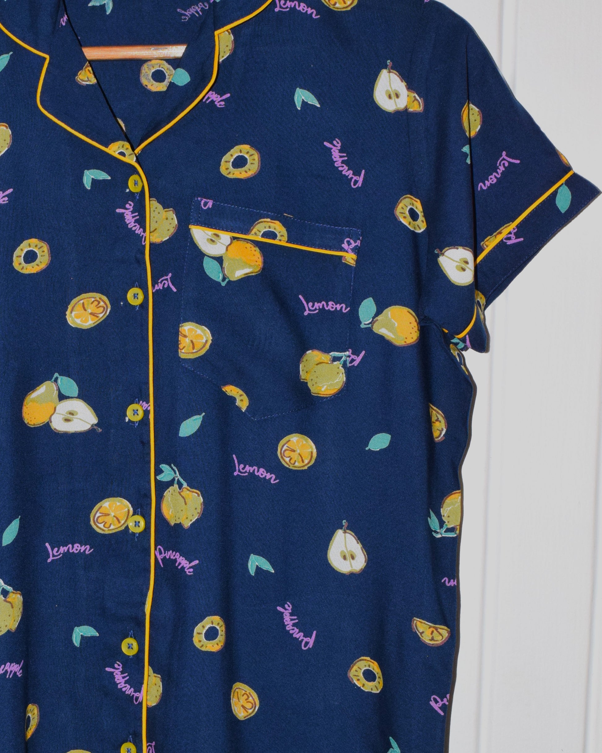 Upgrade your sleepwear collection with our Blue Fruits Rayon Cotton Pajama designed for ultimate comfort and style. Made from soft, breathable Rayon Cotton, this women’s pajama set ensures a relaxed fit for a cozy night's sleep. Featuring a button-down top with pockets, a trendy fruit print, and lightweight fabric, this printed pajama set is perfect for lounging or sleeping in any season.