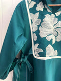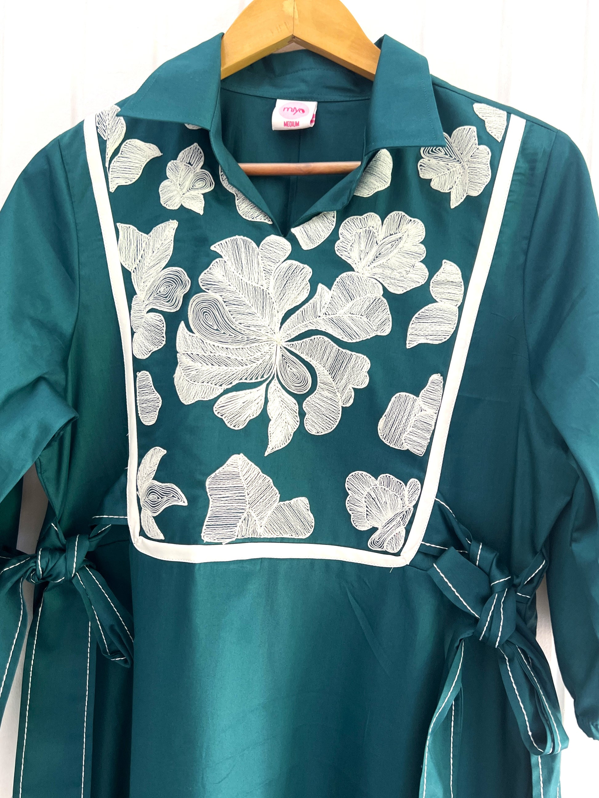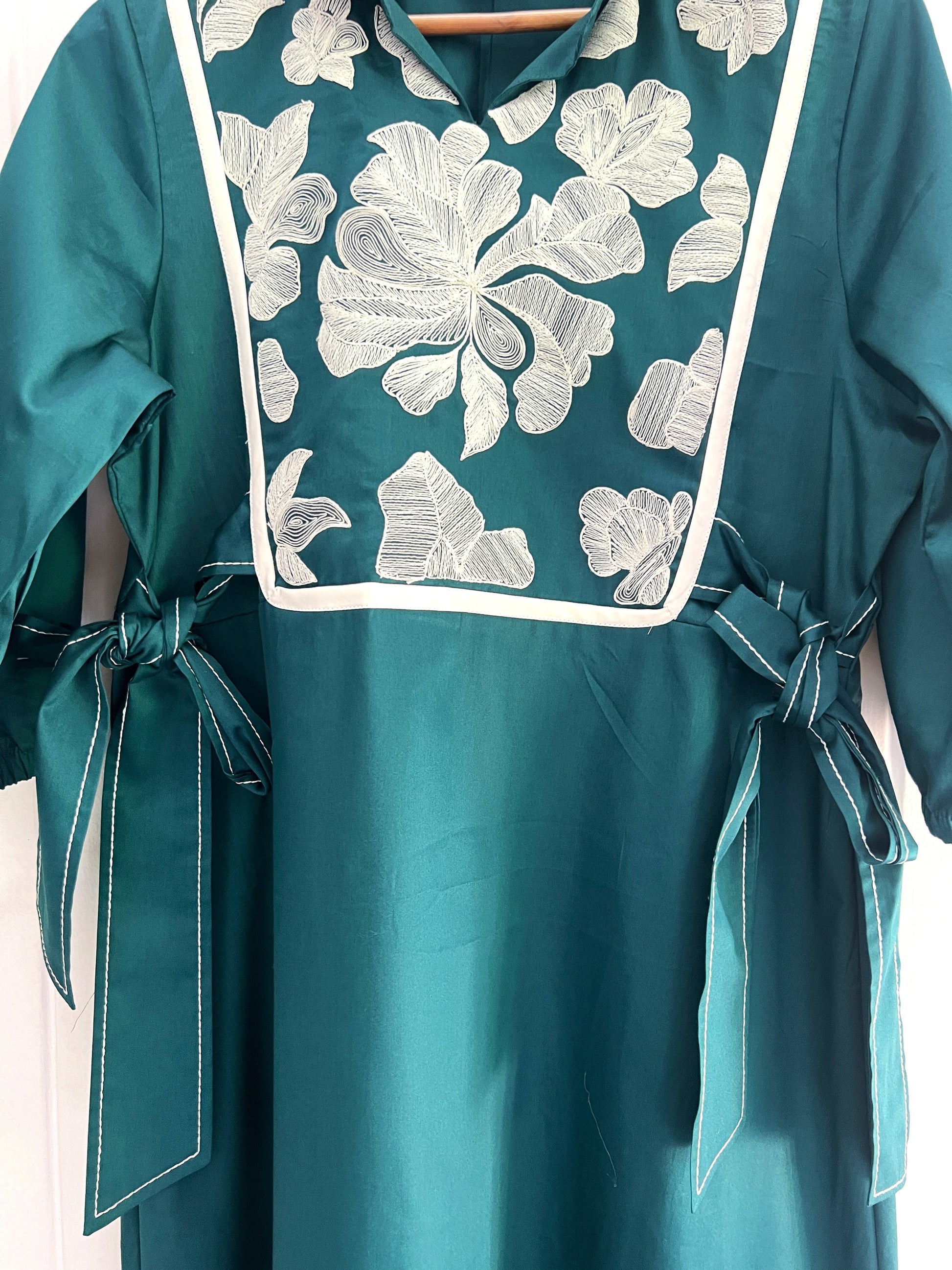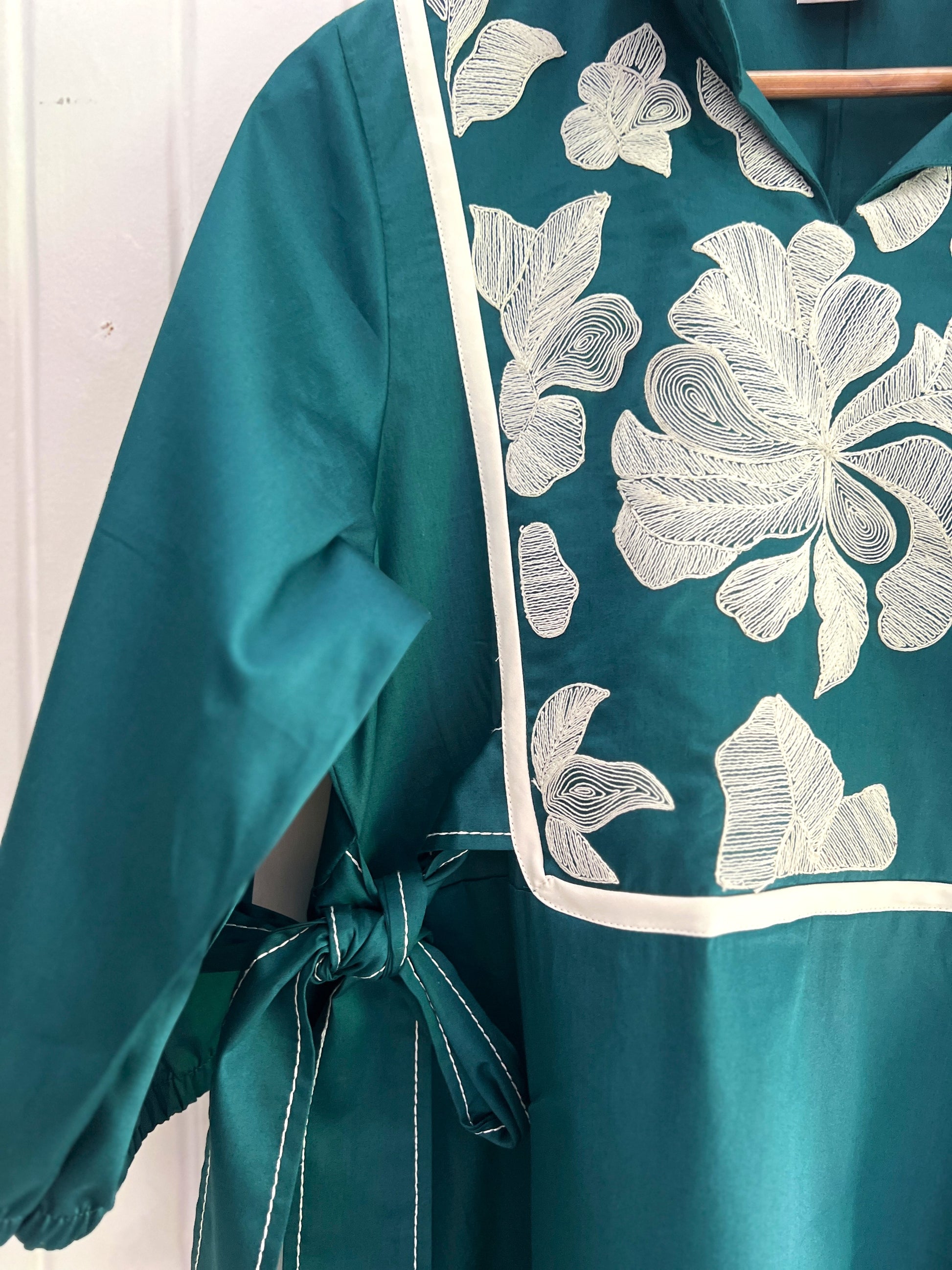 Make a statement with our Emerald Bloom Side-Tie Dress, a perfect fusion of grace and comfort. Designed in luxurious cotton satin, this dress offers a smooth, breathable feel that drapes beautifully. The delicate floral embroidery on the bodice adds a touch of elegance, while the contrast piping and side tie-up details create a flattering silhouette. Whether you're dressing up for a special occasion or keeping it casual, this versatile dress brings effortless charm to your wardrobe.