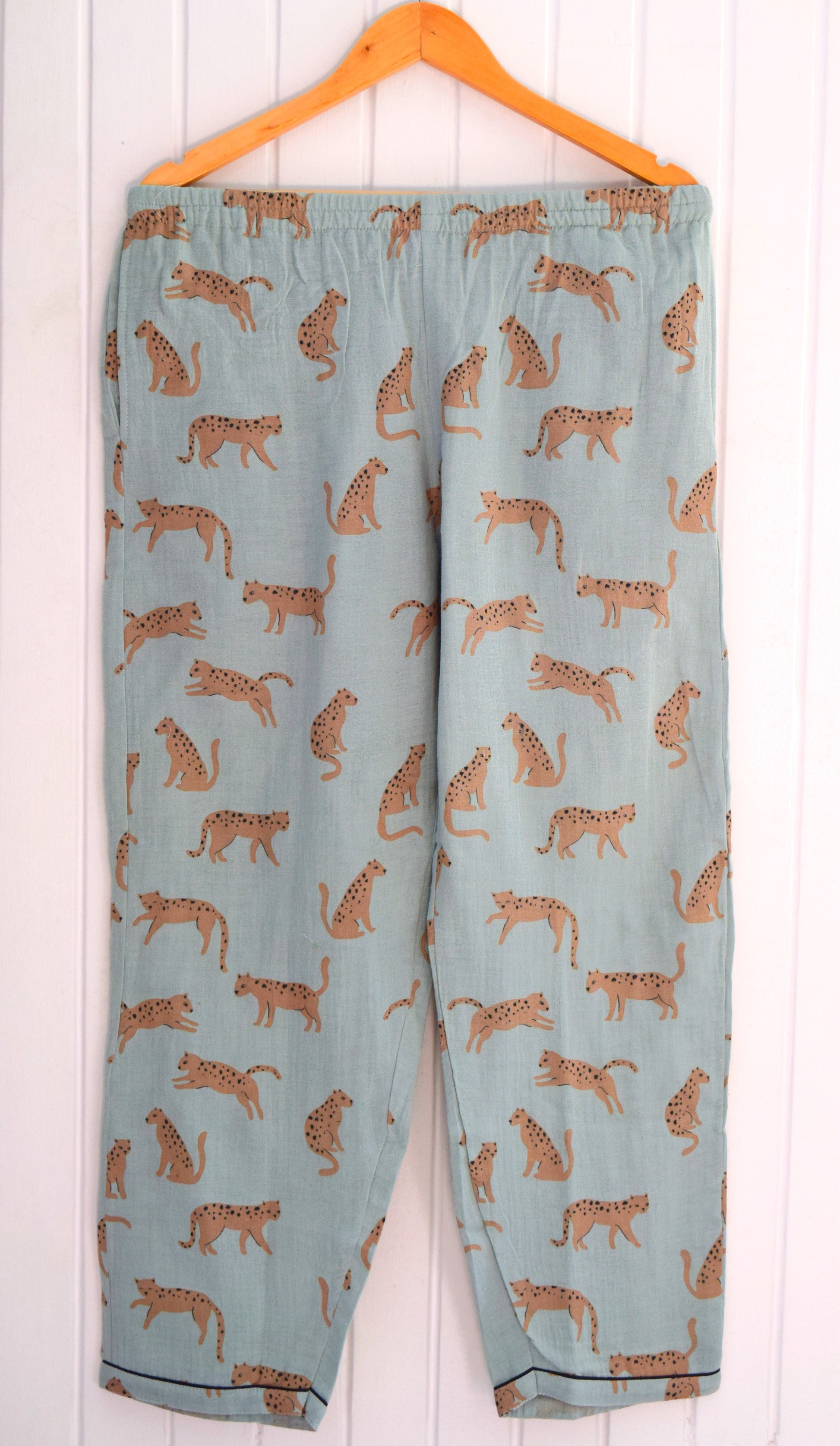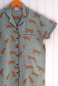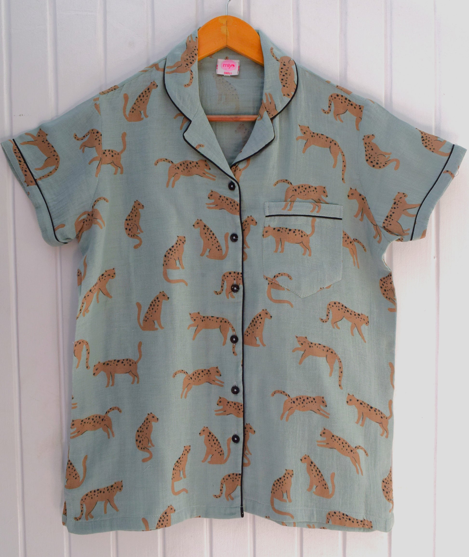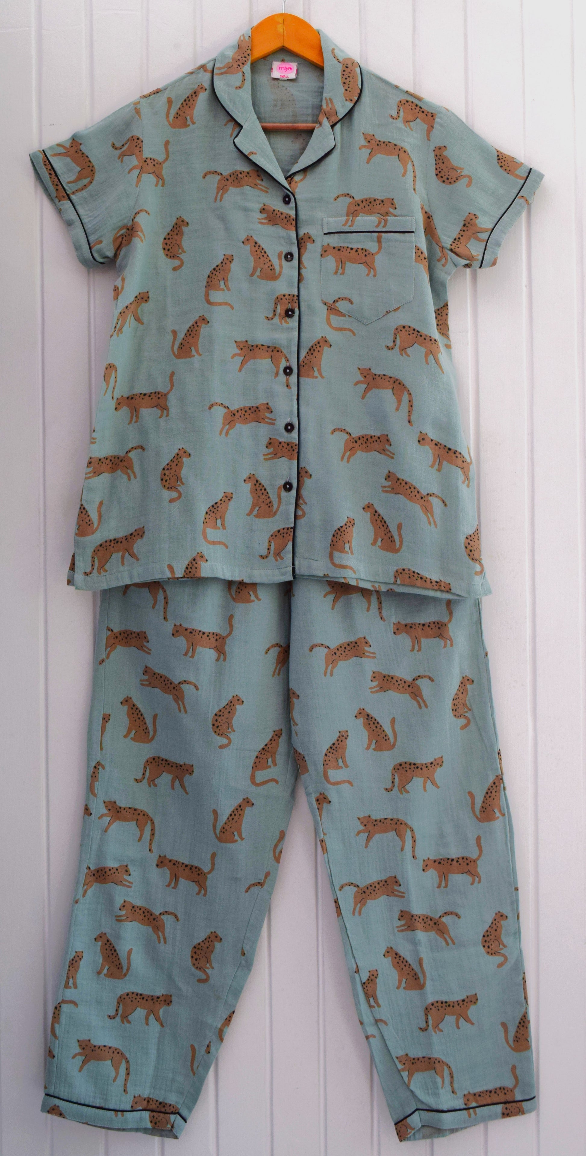 Unleash your wild side with the Green Cheetah Cotton Double Cloth PJ Set. Crafted from premium cotton double cloth, this comfortable nightwear features an eye-catching cheetah print on a soothing green base. Perfect for cozy sleep and laid-back lounging, the breathable fabric offers a relaxing experience throughout the night.