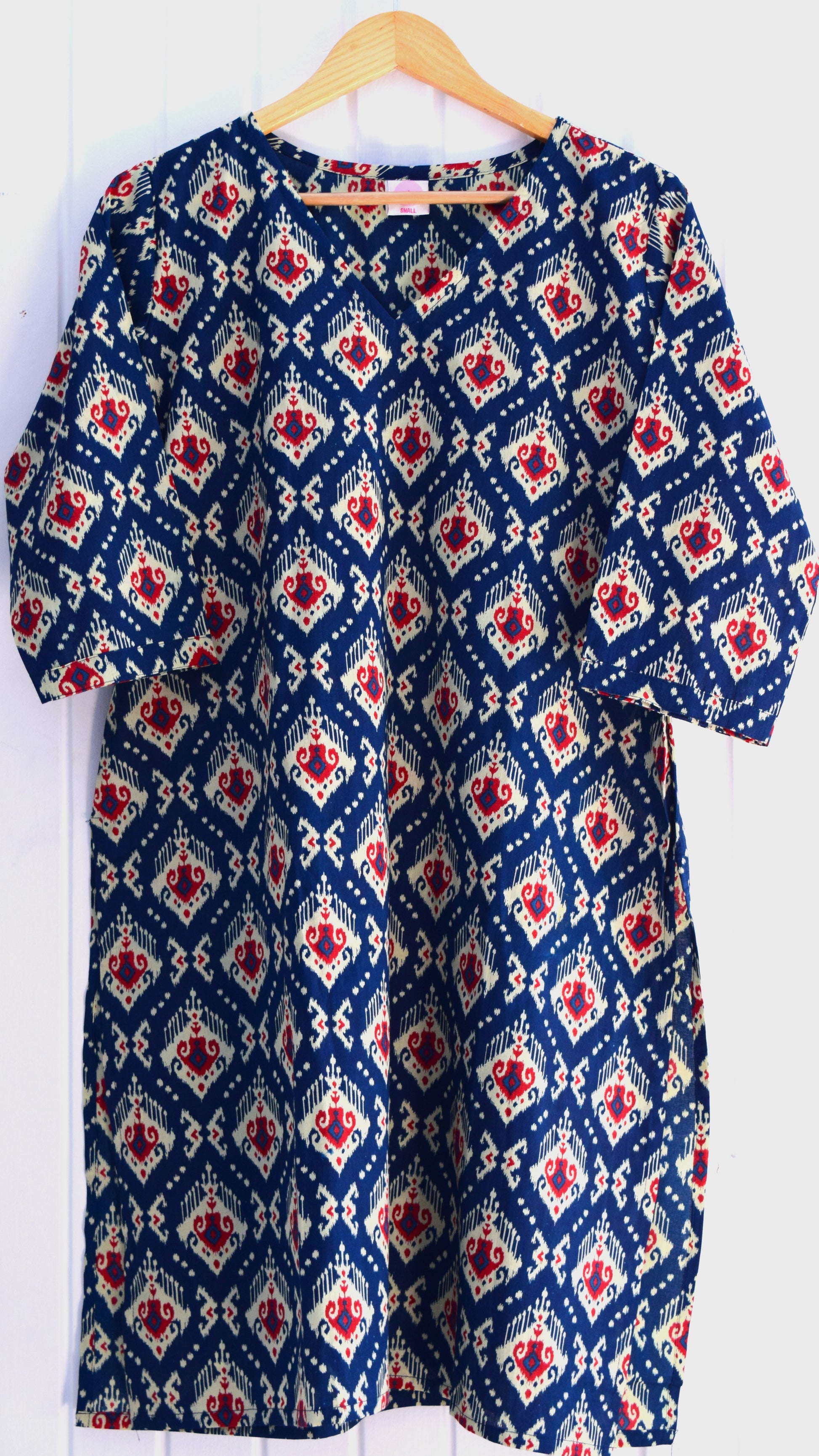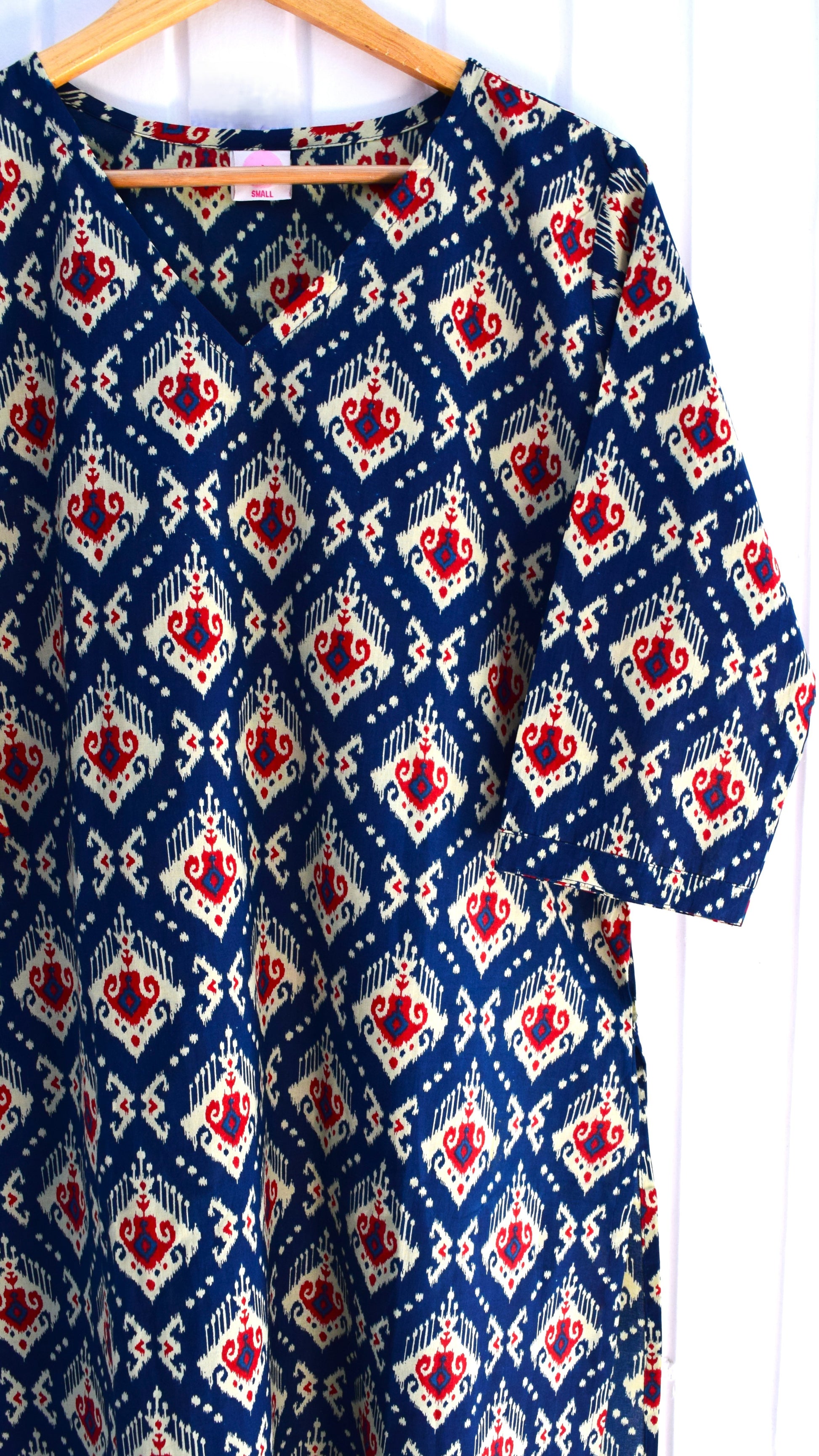 ✔ Ikat-Inspired Handblock Print – Elegant indigo, red & cream hues