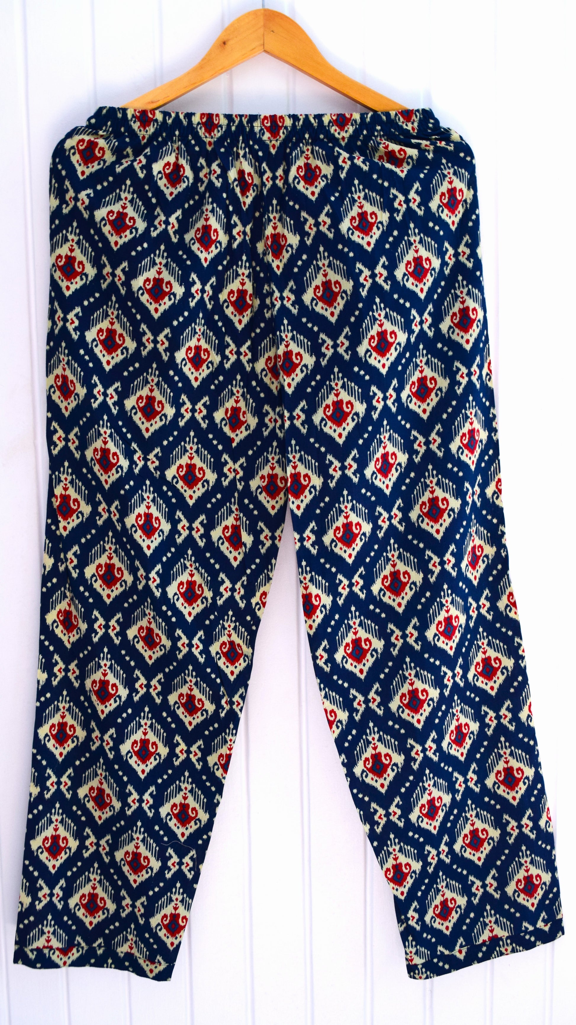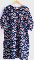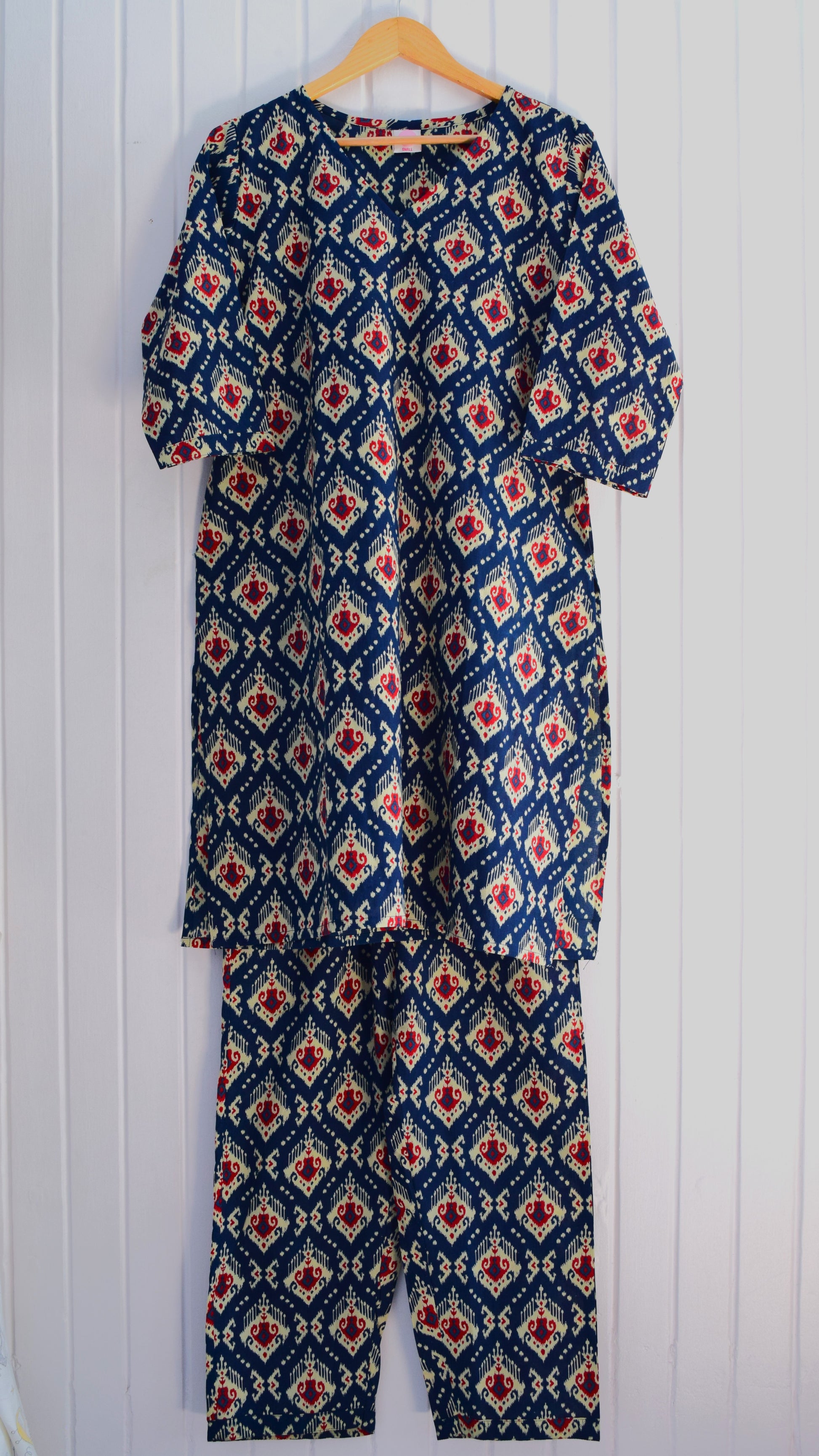 The rich indigo blue base is adorned with stunning Ikat-inspired handblock motifs in red and cream, adding a touch of artisanal charm. The relaxed-fit kurta with a round neckline and comfortable straight-leg pants offers both style and ease, making it an essential addition to your wardrobe.