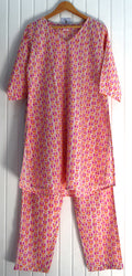 Embrace comfort and style with our Jaipuri Bliss Loungewear Set, designed for effortless relaxation. Made from 100% pure Jaipuri cotton, this breathable and lightweight set ensures all-day ease. The vibrant pink and orange ethnic print brings a charming and traditional touch, making it a perfect choice for lounging or casual outings.