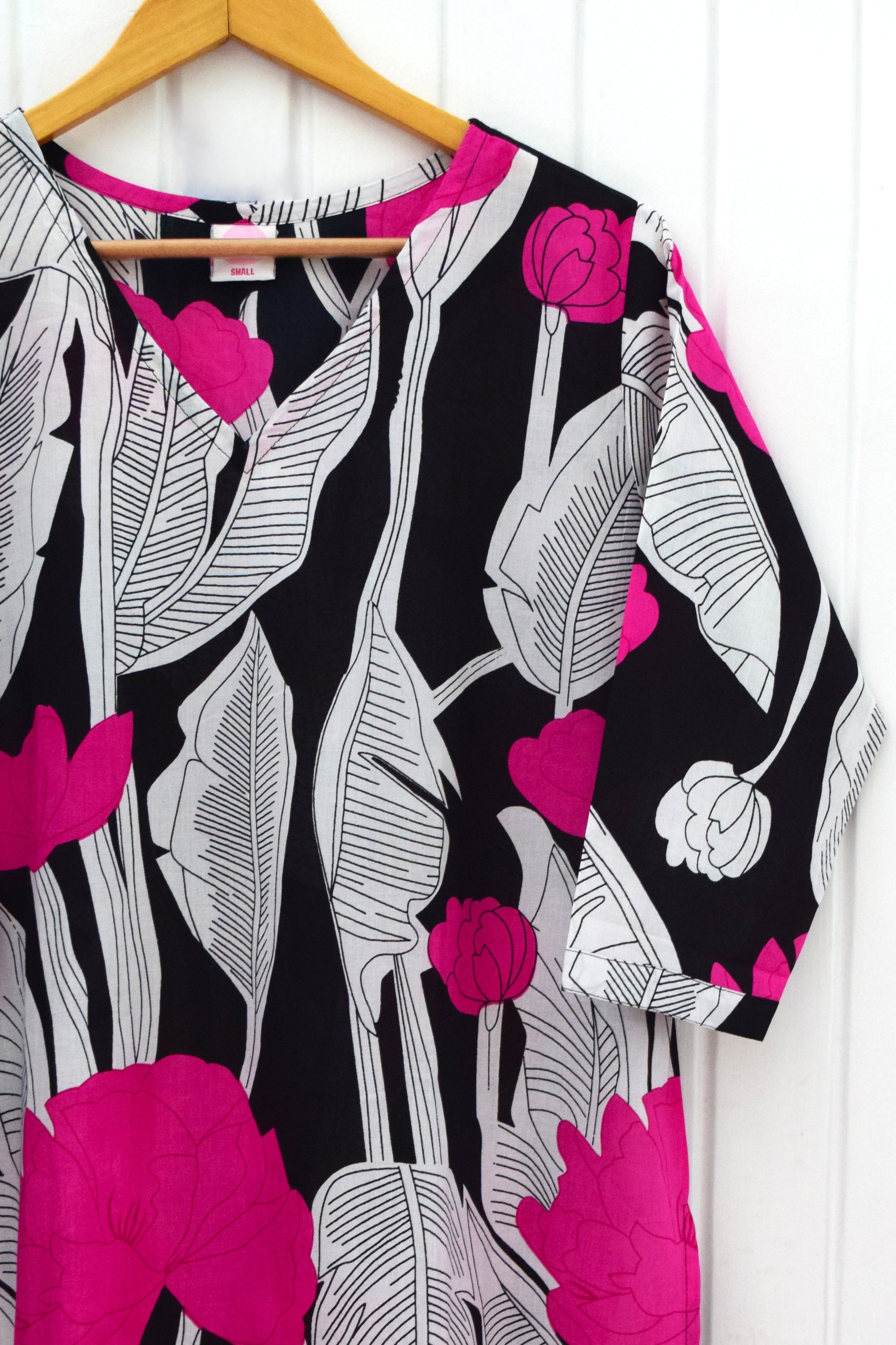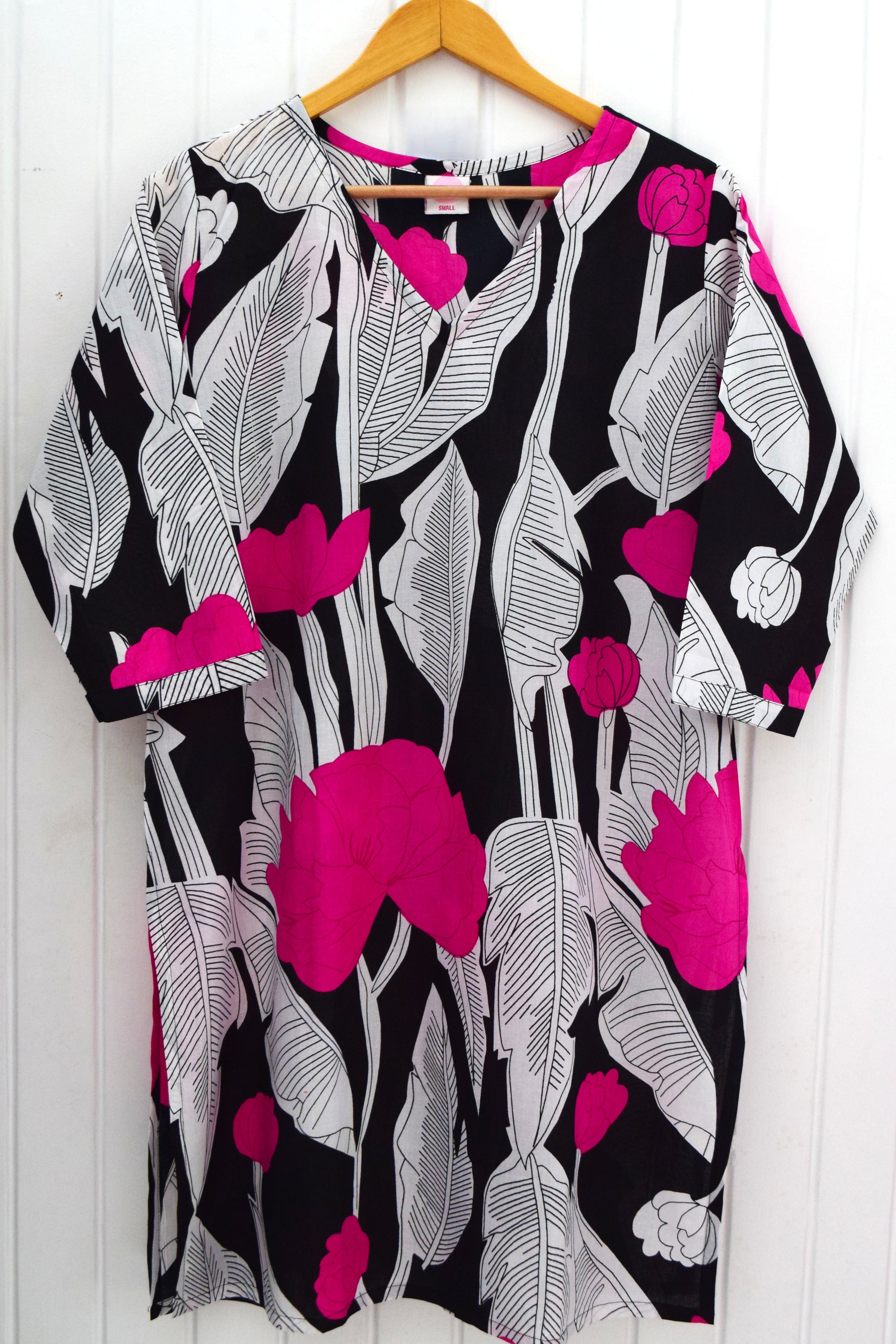 β Bold Floral & Leaf Print β Stylish black base with vibrant pink and white details