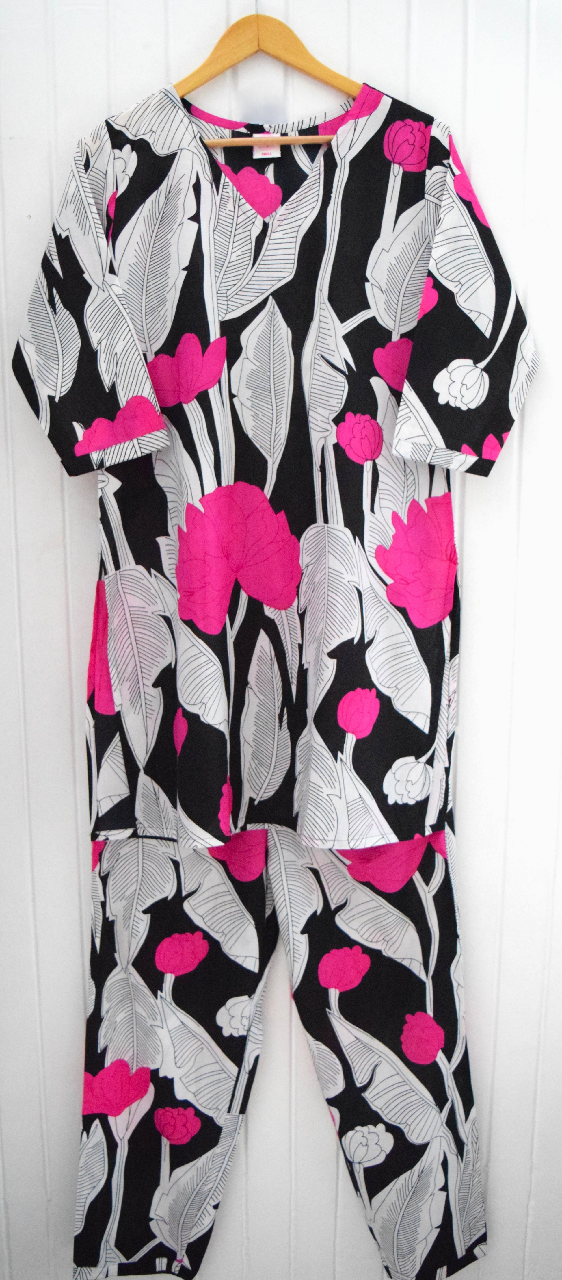 Embrace style and comfort with our Midnight Bloom Cotton Loungewear Set. Designed for those who love to relax in elegance, this set features a bold black base adorned with vibrant pink floral prints and white botanical leaves, creating a perfect blend of sophistication and charm. Crafted from 100% breathable cotton, it ensures a soft and airy feel, making it ideal for lounging, casual wear, or a cozy night's sleep.