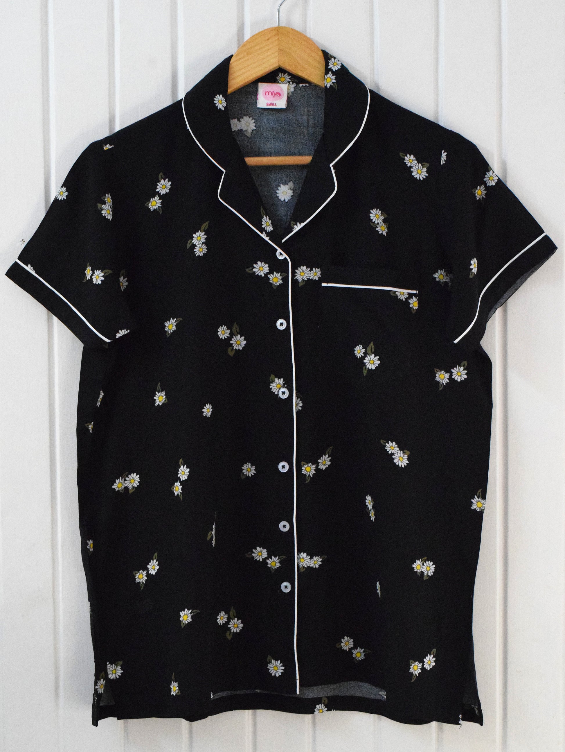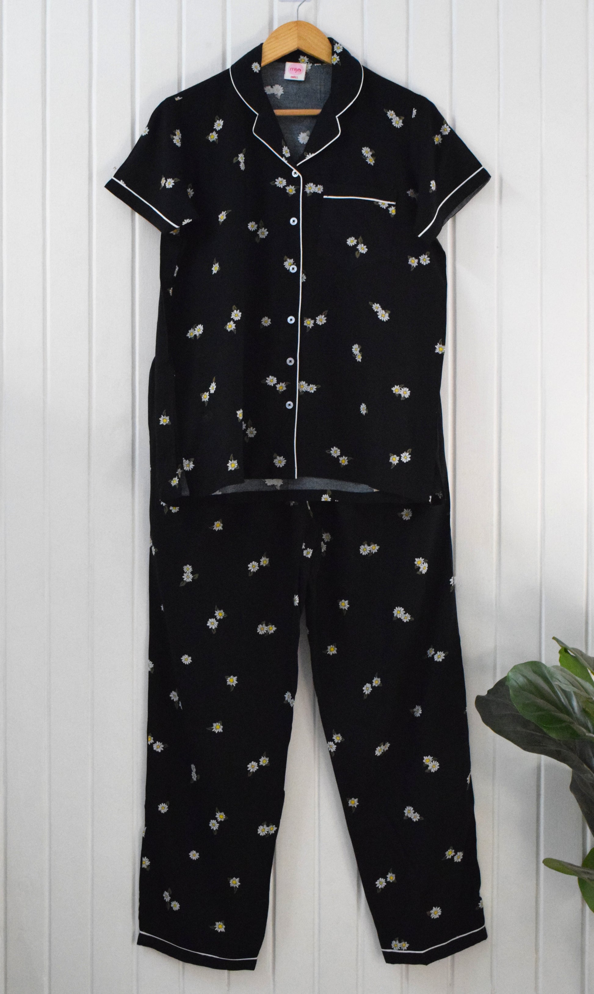 Drift into comfort with our Midnight Daisy Cotton PJ Set. Made from lightweight, breathable cotton, this set is designed to keep you cozy while looking effortlessly chic. The delicate daisy print on a black base adds a touch of elegance, making it perfect for both lounging and sleeping.
