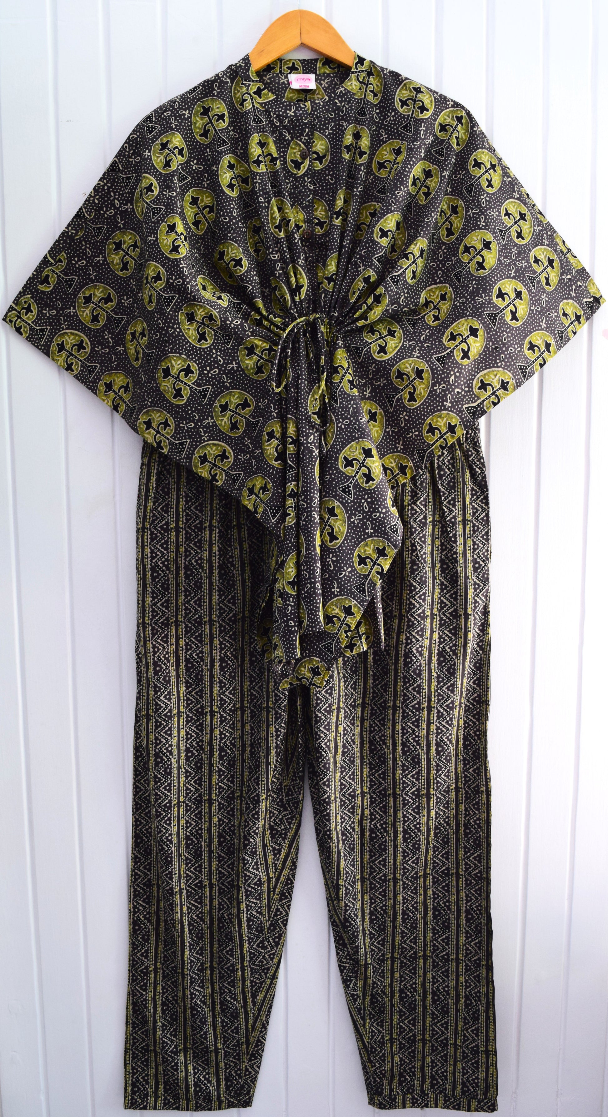 Step into timeless elegance with our Regal Dusk Jaipuri Cotton Kaftan Set, designed for those who love a blend of comfort and sophistication. Crafted from authentic Jaipuri cotton, this breathable and lightweight fabric ensures all-day ease while exuding an air of refined luxury. The stunning handblock print in deep black and olive tones showcases intricate craftsmanship, making this set a versatile choice for lounging, vacations, or casual outings. The flowy kaftan top with an adjustable drawstring waist offers a relaxed yet flattering fit, paired with matching soft cotton pants for effortless elegance.