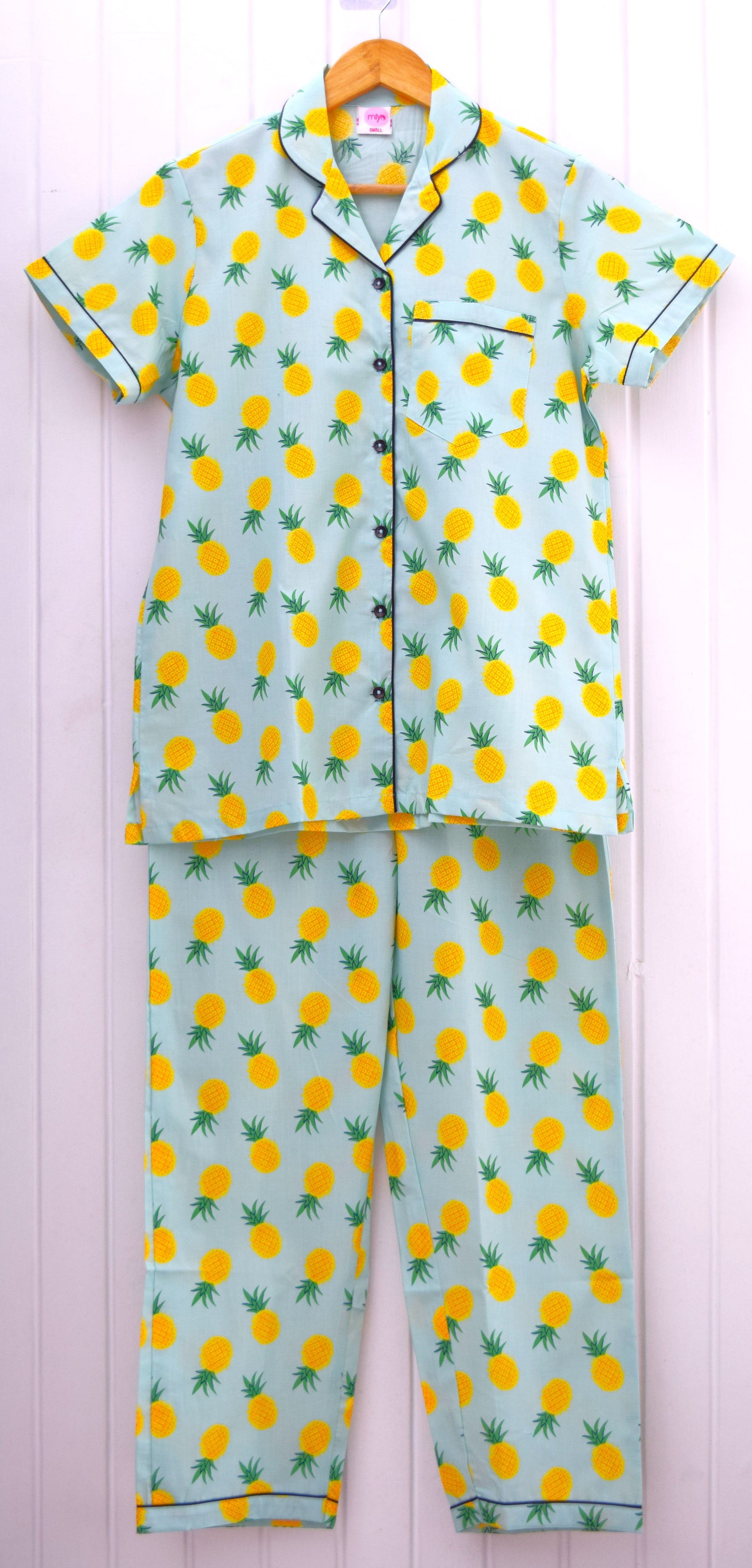 Bring a slice of tropical paradise to your nights with our Tropical Pineapple Pajama Set! Featuring a fun and vibrant pineapple print on a soothing pastel blue base, this set is perfect for lounging in style and comfort. Made from a breathable rayon-cotton blend, it ensures a soft, lightweight feel for a relaxing night’s sleep.