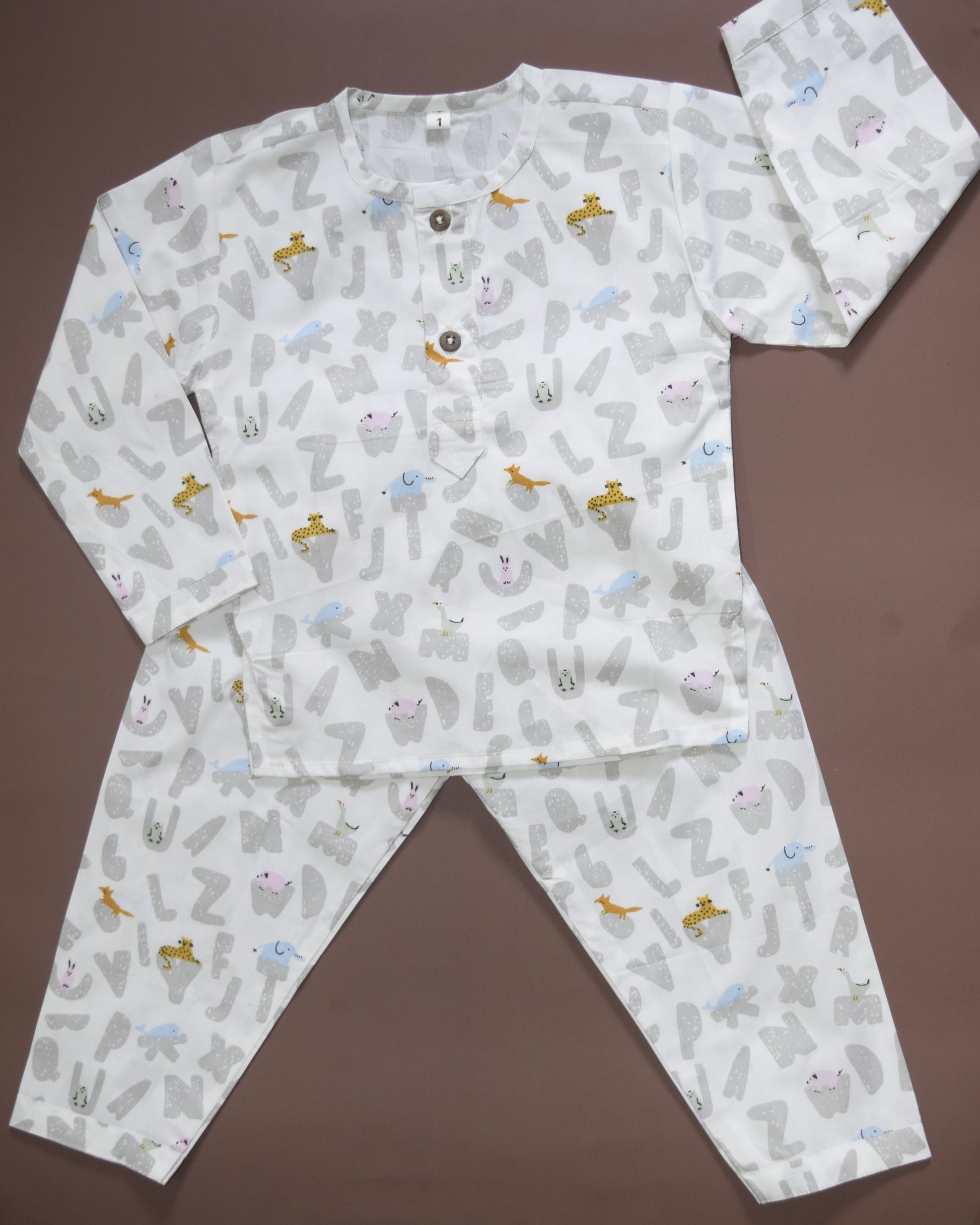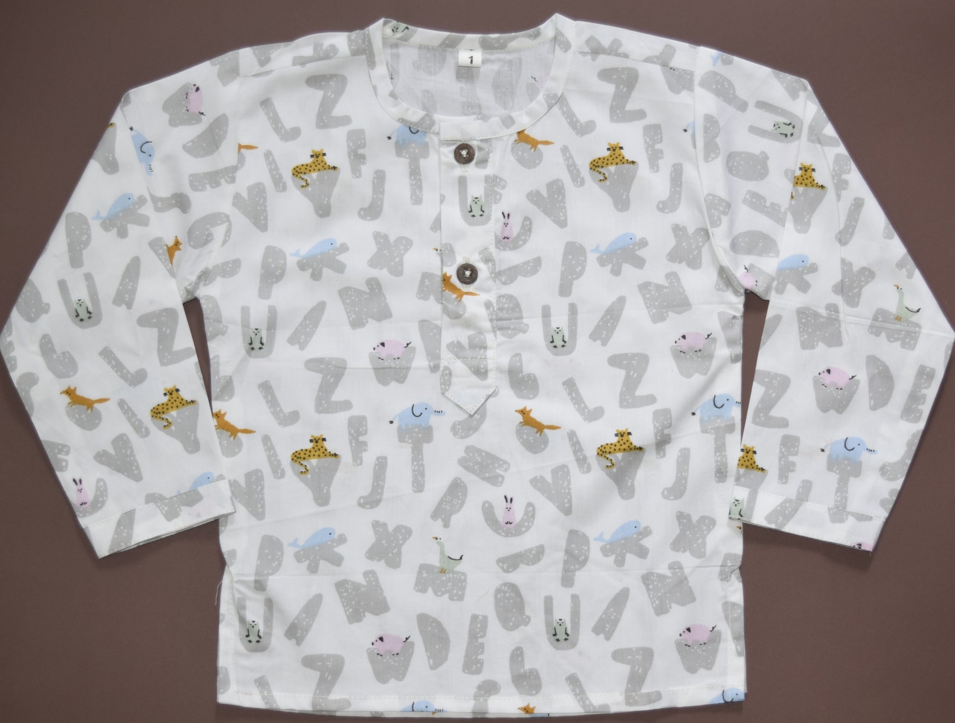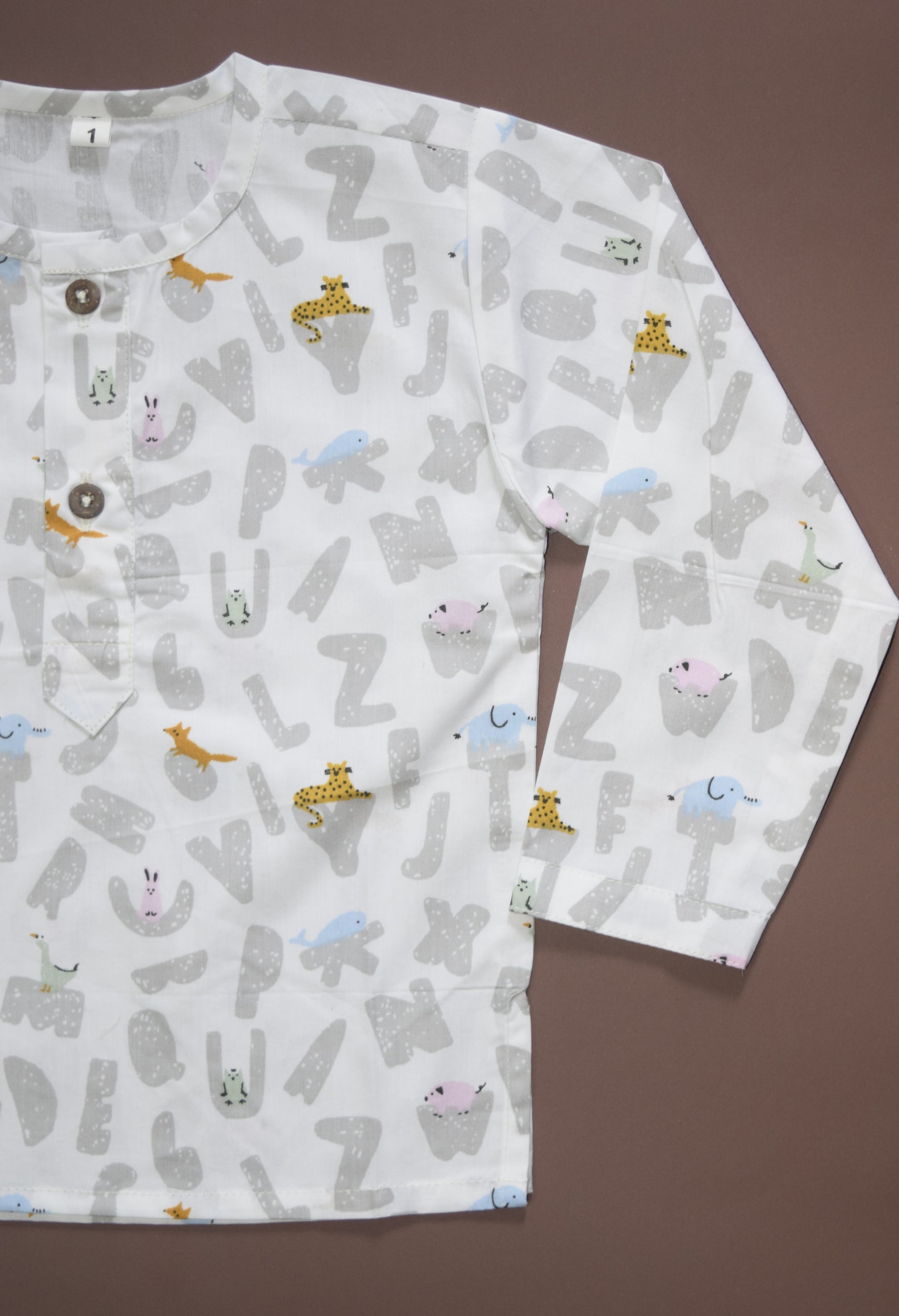 Introduce your little one to stylish comfort with this White ABCD Print Cotton Kurta for Kids. Designed with a charming alphabet and animal motif, this kids kurta is perfect for casual outings, playdates, or festive occasions. Made from breathable and lightweight cotton fabric, this cotton kurta for kids ensures all-day comfort while maintaining a chic look. Featuring a classic buttoned neckline and a relaxed fit, this cotton kurta is easy to wear and allows free movement. Upgrade your child’s wardrobe with this versatile and adorable kurta for kids, blending style, functionality, and comfort seamlessly!